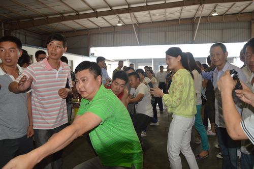 比賽在客運(yùn)西站與南明物流的對(duì)決中首先開(kāi)始。隨著裁判的一聲哨響,霎時(shí)間,加油聲和歡笑聲便響徹了整個(gè)修理車(chē)間。隊(duì)伍間實(shí)力相差懸殊的,裁判員比賽哨聲剛落,比賽就已經(jīng)結(jié)束了,引來(lái)了一陣陣歡笑聲;實(shí)力在伯仲之間的,那可就精彩了,加油鼓勁的喊破了嗓子,大力士們也是漲紅了臉,累得渾身冒汗。