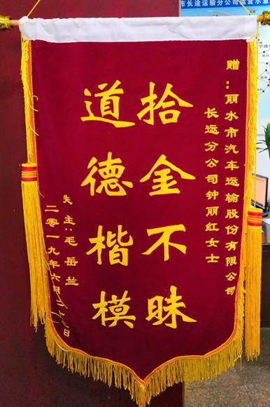 7月5日上午,一位老大爺來東站找到車隊,將一面寫著“拾金不昧,道德楷?!卑藗€大字的大紅錦旗,送到長運(東站)車隊長鄭國勇手里,一定要好好感謝車隊駕駛員鐘麗紅。