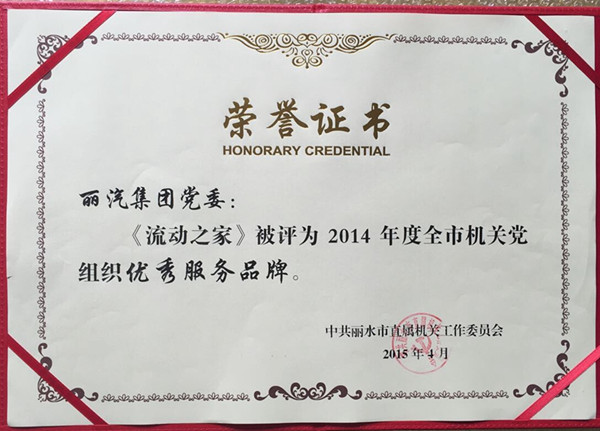 近日,麗汽集團(tuán)“流動(dòng)之家”服務(wù)品牌在中共麗水市直屬機(jī)關(guān)工作委員會(huì)開(kāi)展的2014年度全市機(jī)關(guān)黨組織優(yōu)秀學(xué)習(xí)品牌、優(yōu)秀服務(wù)品牌評(píng)選活動(dòng)中,喜獲“2014年度全市機(jī)關(guān)黨組織優(yōu)秀服務(wù)品牌”稱(chēng)號(hào)。