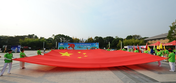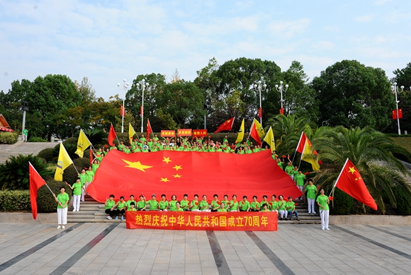 9月29日一早的濱水公園,在8面紅旗和8面麗汽集團司旗的簇擁下,16名旗手莊重地鋪展開一面巨幅國旗。早早趕來的麗汽員工和在公園晨練的市民紛紛在國旗前拍照留念。那一抹鮮艷的中國紅,映照出的不僅是人們的笑臉,還有所有人心中對祖國的依戀。