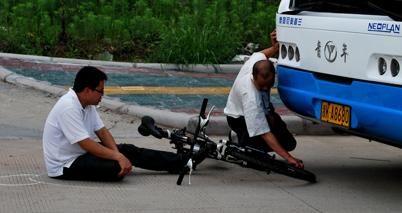 場景二:模擬一輛快客班車滿載旅客從客運西站發(fā)車,行駛在公路上,由于一輛騎自行車人從右向左突然橫穿,駕駛員采取避讓和制動措施不及,與自行車發(fā)生碰撞,導致騎車人受傷倒地。駕駛員立即停車查看騎車人受傷情況,打110報警和打120急救,將事故情況報告至快客公司,設(shè)置好現(xiàn)場警示牌,勸導下車的旅客回車內(nèi),快客公司安排車輛前往事故地點進行駁客,同時快客公司分管安全的經(jīng)理和安全員一起前往事故現(xiàn)場。交警到達現(xiàn)場,進行事故現(xiàn)場勘查;120急救車到達現(xiàn)場,帶走受傷騎車人;快客公司分管安全的經(jīng)理和安全員到達事故現(xiàn)場;駁客車到達現(xiàn)場,將事故車輛乘客駁走。