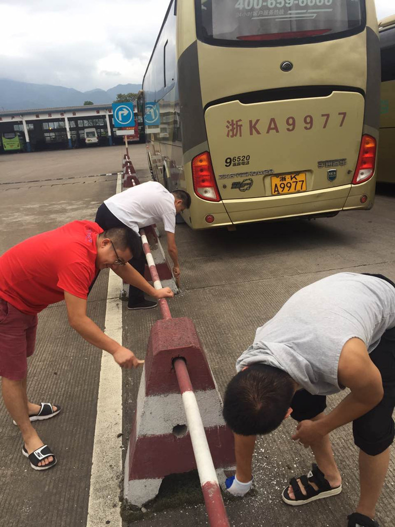 站場內的隔離設施由于長時間的日曬雨淋,出現(xiàn)了嚴重的油漆脫落現(xiàn)象。8月31日早上6點,志愿者們又拿來鋼絲刷,先把隔離墩上還沒脫落完的油漆刷干凈,再用調好的油漆,重新粉刷隔離設施。